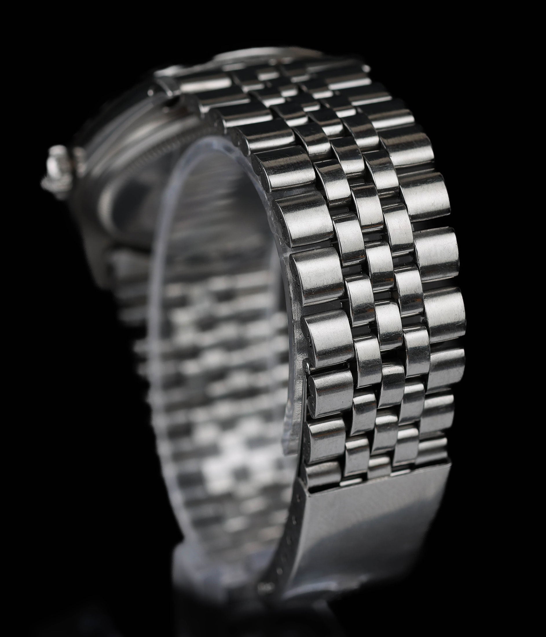 The Rolex Datejust 1603 from 1969 features a 36mm stainless steel case and a rare confetti dial. It is powered by a reliable automatic movement.